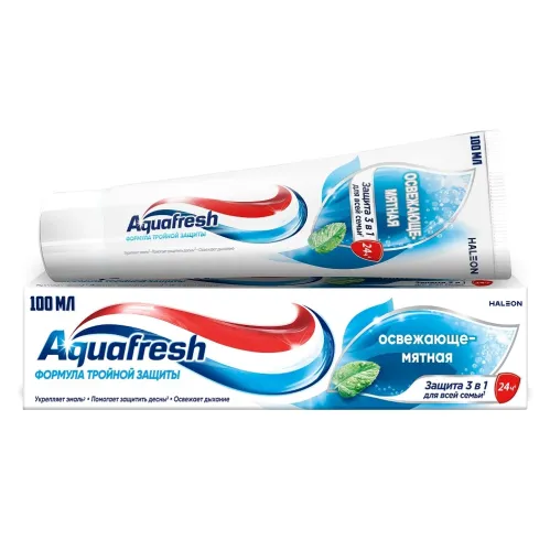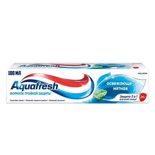 Зубная паста Aquafresh Тройная защита Освежающе-мятная обеспечивает тройную защиту полости рта для поддержания здоровья зубов и десен, а также свежего дыхания. Фтор в составе зубной пасты помогает укреплять эмаль зубов и защищать ваши зубы от кариеса.