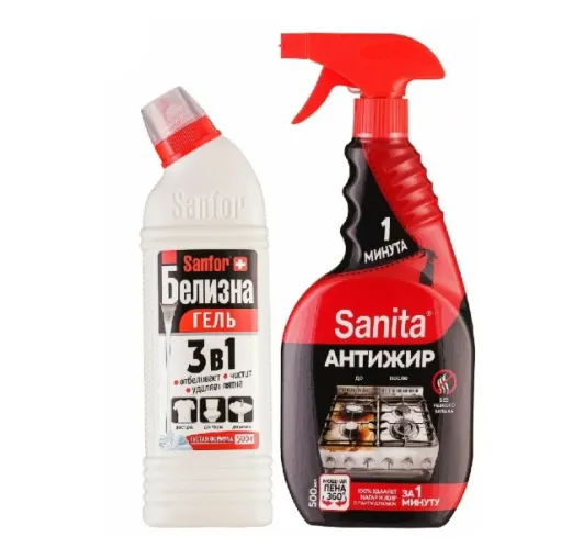 - Набор Sanita Чистящее средство Антижир 1 минута 500мл и Белизна-гель Sanfor отбеливатель 3в1 450 мл