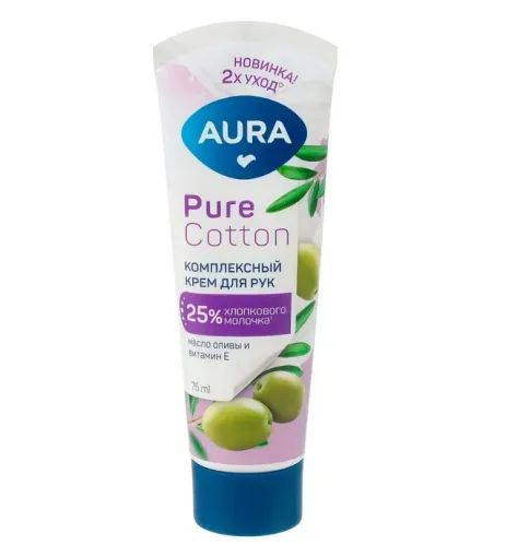 Крем для рук Aura Pure Cotton, комплексный, масло оливы и витамином E, 75 мл Комплексный уход: крем содержит в себе ингредиенты, необходимые для ежедневного полноценного ухода за кожей рук. Оливковое масло восстанавливает и питает кожу. Хлопковое молочко способствует естественному увлажнению и смягчению кожи. Витамин Е способствует обновлению клеток и помогает предотвратить гиперпигментацию